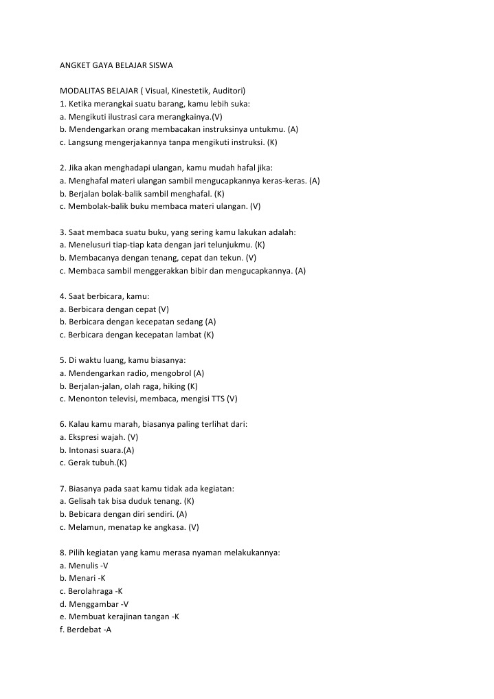Kuesioner gaya belajar siswa sd kelas tinggi dan smp b. Guru wajib tahu ciri khusus tersebut agar bisa menerapkan strategi pembelajaran yang tepat. Adanya tabel dan grafik yang bisa memperdalam pemahaman mahasiswa. Membutuhkan gambaran dan tujuan menyeluruh dan menangkap detail, mengingat apa yang dilihat. Gaya belajar visual (visual learner) ini adalah gaya belajar yag menitikberatkan ketajaman mata/penglihatan.